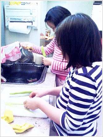 ※ 荳芽和容真準備做壽司的食材。分工。專心。